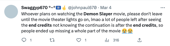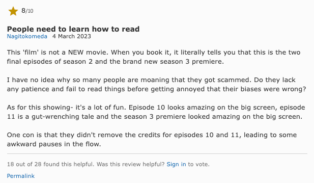 Despite the negative feedback, To the Swordsmith Village is guaranteed to be a money-maker. It ranked #1 in its opening weekend in Japan. That being said, the producers shouldn’t be surprised if future theatrically-released TV anime episodes bring in fewer viewers now that their users’ mental models for what theatrical experiences can be has been stretched in a new, disappointing direction.