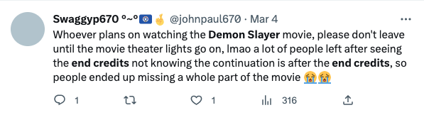 Despite the negative feedback, To the Swordsmith Village is guaranteed to be a money-maker. It ranked #1 in its opening weekend in Japan. That being said, the producers shouldn’t be surprised if future theatrically-released TV anime episodes bring in fewer viewers now that their users’ mental models for what theatrical experiences can be has been stretched in a new, disappointing direction.