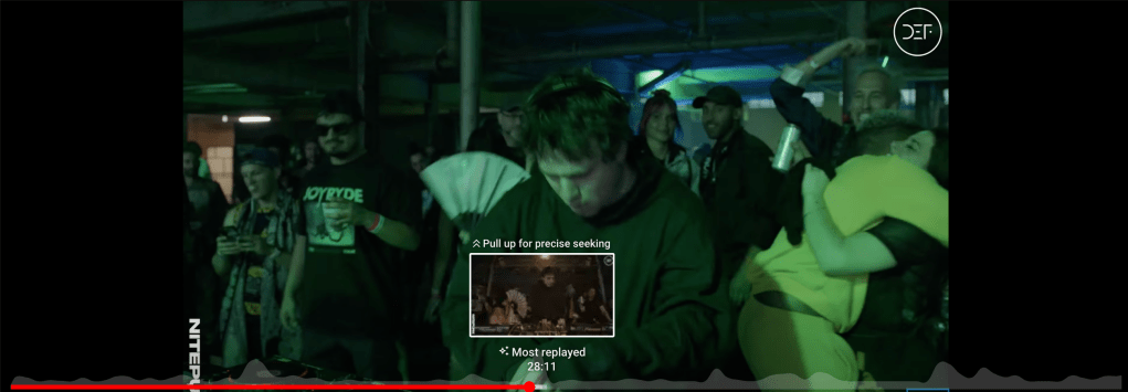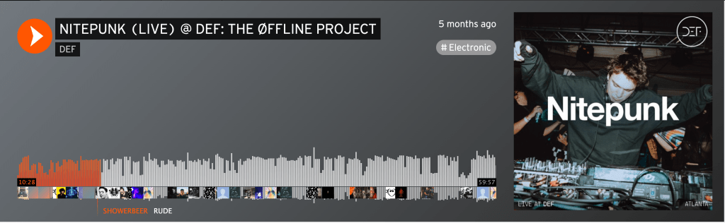 YouTube also has its own version of Nitepunk’s DEF mix. Unbeknownst to me, the whole thing was filmed in addition to being recorded! 😳 By holding my cursor over the red video progress bar at the bottom of the screen, a waveform visualization of this track distinct from Soundcloud’s presents itself. Unlike Soundcloud’s waveform, which shows volume, this waveform shows which points of the video were the “most replayed.”