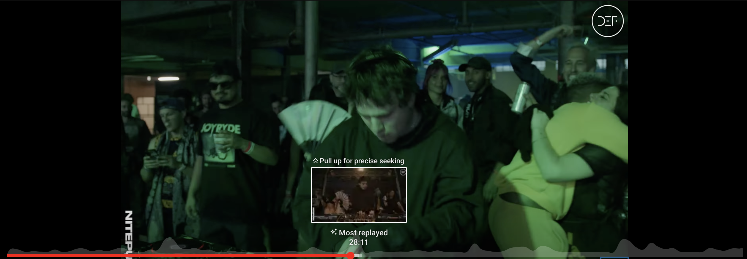 YouTube also has its own version of Nitepunk’s DEF mix. Unbeknownst to me, the whole thing was filmed in addition to being recorded! 😳 By holding my cursor over the red video progress bar at the bottom of the screen, a waveform visualization of this track distinct from Soundcloud’s presents itself. Unlike Soundcloud’s waveform, which shows volume, this waveform shows which points of the video were the “most replayed.”